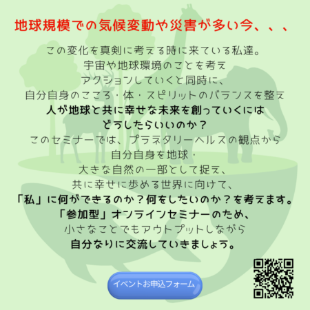 このセミナーでは、プラネタリーヘルスの観点から自分自身を地球・